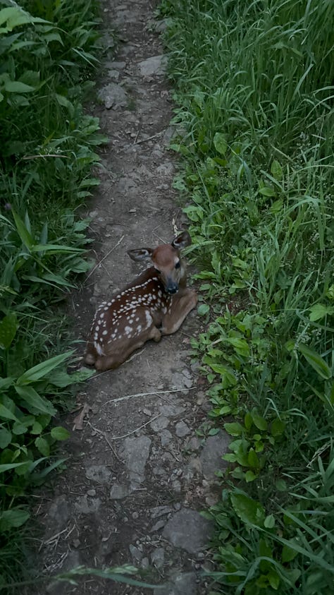 …a newborn deer nursing her mother! The baby could barely stand, and as we attempted to squeeze by her on the trail, she tried running away (more like stumbling) for about six feet before diving her head into the bushes—her body sticking out on the trail.